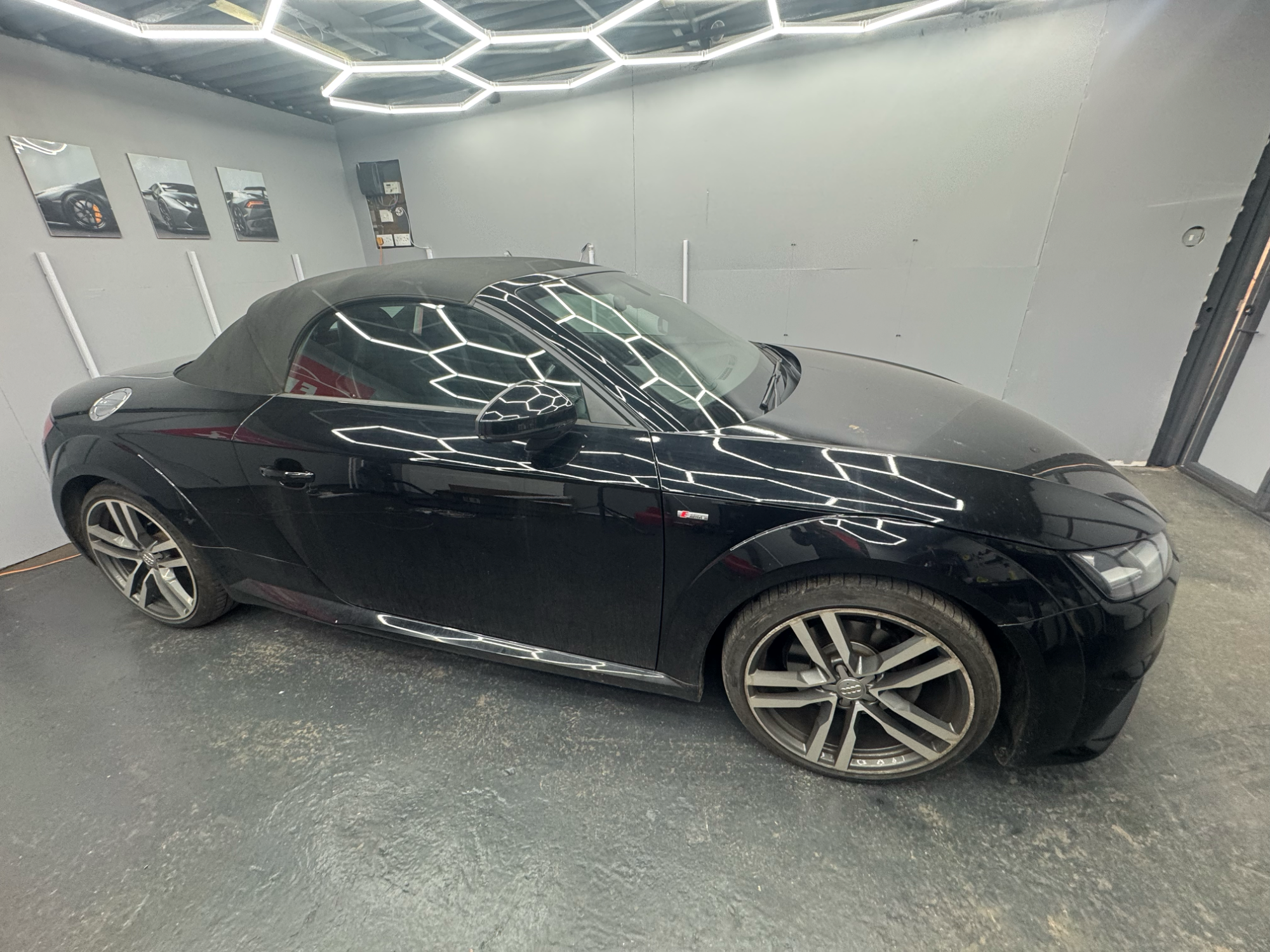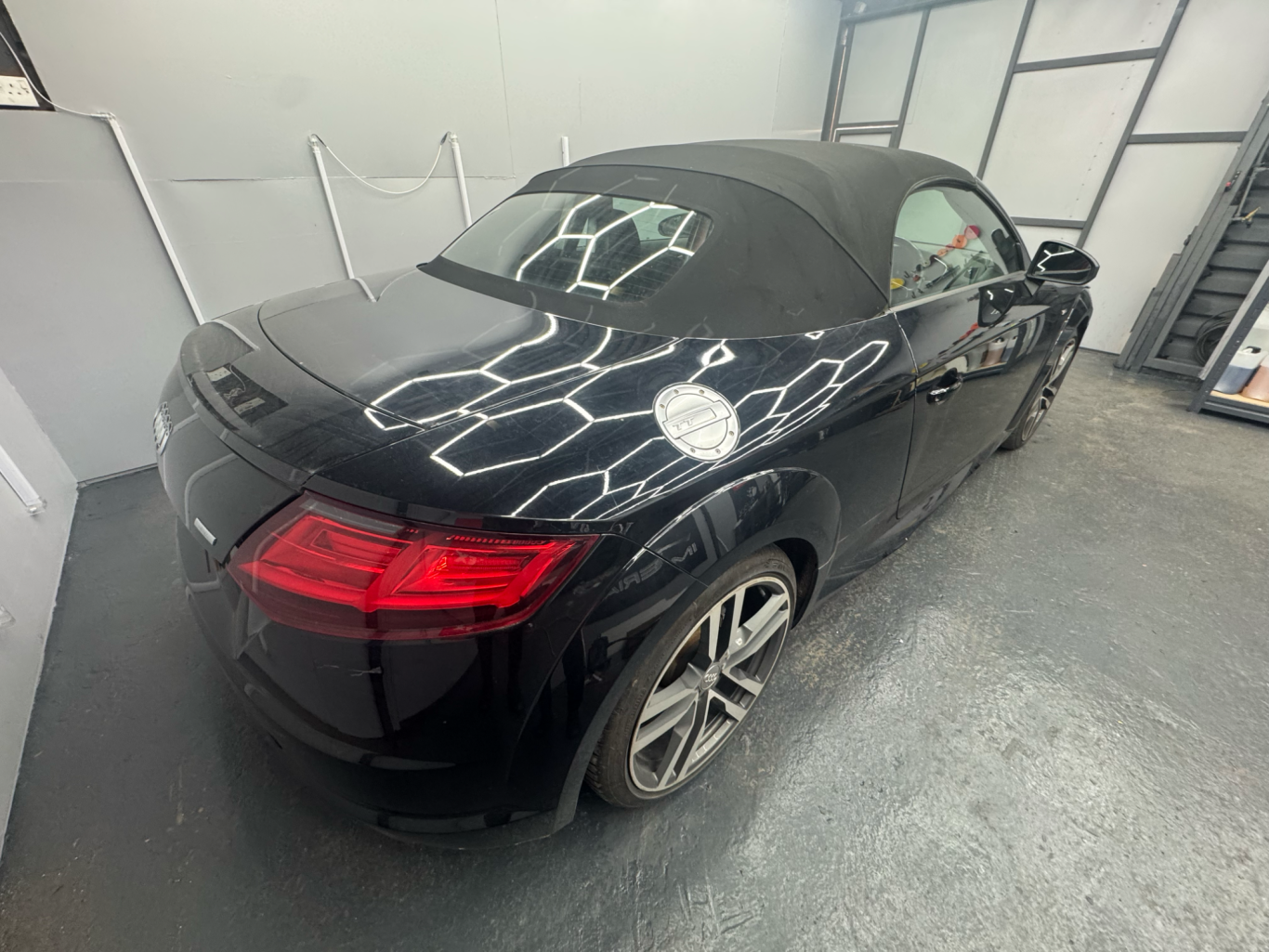 Black Audi TT in need of cosmetic attention, particularly to the paintwork. The exterior shows signs of neglect with dullness, light scratch